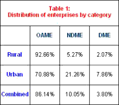 While the unregistered sector accounts for a significant share of manufacturing employment and production, the structure of the sector remains heavily biased in favour of small and organizationally 'primitive' units. Across rural and urban areas, own account manufacturing enterprises (OAMEs), or those that employ no hired labour on a 'regular basis', account for an overwhelming 86 per cent of all enterprises. Though the presence of OAMEs is greater in rural areas, their share in total enterprises in urban areas too amounts to a remarkable 71 per cent. Further, both in rural and urban areas, more than 70 per cent of the units employing hired workers are non-directory manufacturing establishments, or those employing less than six workers.