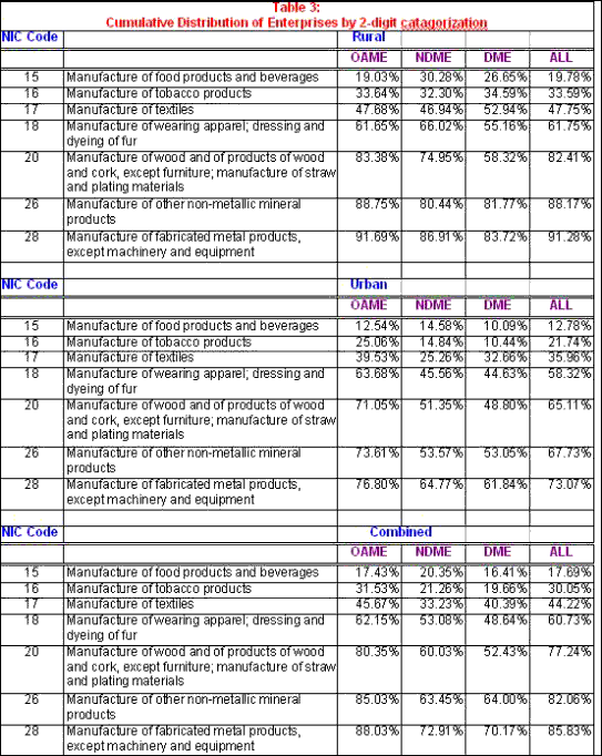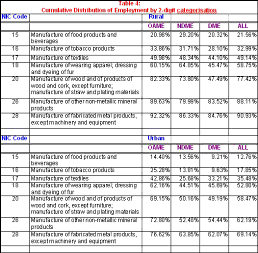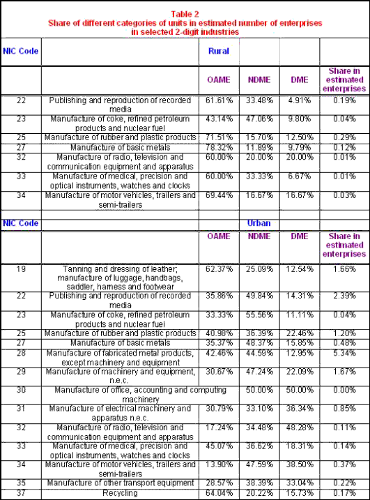 Table 2 provides a picture of the two-digit industrial categories in which OAMEs account for less than 80 per cent of all enterprises in rural areas, and 66 per cent of all enterprises in urban areas. While in the rural areas there are just 7 of the 24 industries covered by the 56th Round that meet these stringent criteria, there are 14 out of 24 in the urban areas in which less than two-thirds of the units are OAMEs. Further, these sectors account for less than 1 and 15 per cent, respectively, of all enterprises in rural and urban areas. Clearly, the spread of production based on use of hired labour on a fairly regular basis is limited within the unregistered sector in both rural and urban areas.
