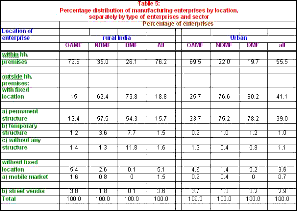 The primitive nature of a substantial segment of the unregistered manufacturing sector is also reflected in the fact that 70 per cent of all units are typically 'household units', in the sense that they are located in household premises. This high proportion is of course explained primarily by OAMEs dominating the sector in terms of number of enterprises and as many as 80 per cent of OAMEs in rural areas and 70 per cent in urban areas being located in household premises. But what is noteworthy is the fact that 35 and 22 per cent of NDMEs in rural and urban areas respectively, and 26 and 20 per cent of DMEs, are household units. If operating out of permanent, non-household premises is taken as a minimal prerequisite for a unit being a 'modern' small unit in the unregistered sector, then, only a little more than a half of the small population of NDMEs and DMEs in rural areas and about three-quarters of NDMEs and DMEs in the urban areas would qualify as modern small units or their precursors.