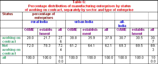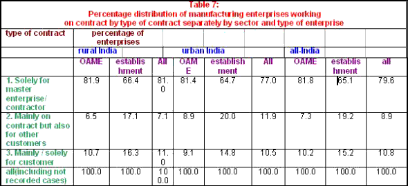 As Table 6 indicates, evidence yielded by the 56th Round suggests that an inter-linkage between the formal and informal sectors is indeed present, even if not overwhelming. Thus, 28 per cent of units in rural areas and 38 per cent of units in urban areas work on contracts, which are likely to be with units or capital from the formal sector. What is noteworthy is that in the rural areas and, to a smaller extent, in the urban areas, the contract system is more prevalent among OAMEs than establishments, pointing to the possibility of penetration by merchant capital in search of cheap home-based production sources that ensure the required returns. This presumption is supported by the evidence that, on average, 80 per cent of the enterprises working under the contract system enter into contracts solely with a master contractor/enterprise.