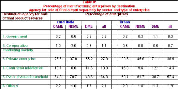 Contractual links notwithstanding, it does not appear from the evidence that these have dominated the choice of product markets for unregistered units: 65 per cent of rural units and 57 per cent of urban units reported that they sold some of their final output to private individuals or households. However, in the case of NDMEs and DMEs, sale of final output to private enterprises or contractors/middlemen was reported. About 37 and 55 per cent of NDMEs and DMEs respectively in rural areas, and 45 and 71 per cent respectively in urban areas reported such sales. Therefore, some kind of input–output linkage and ancillarization do seem to be widely prevalent.